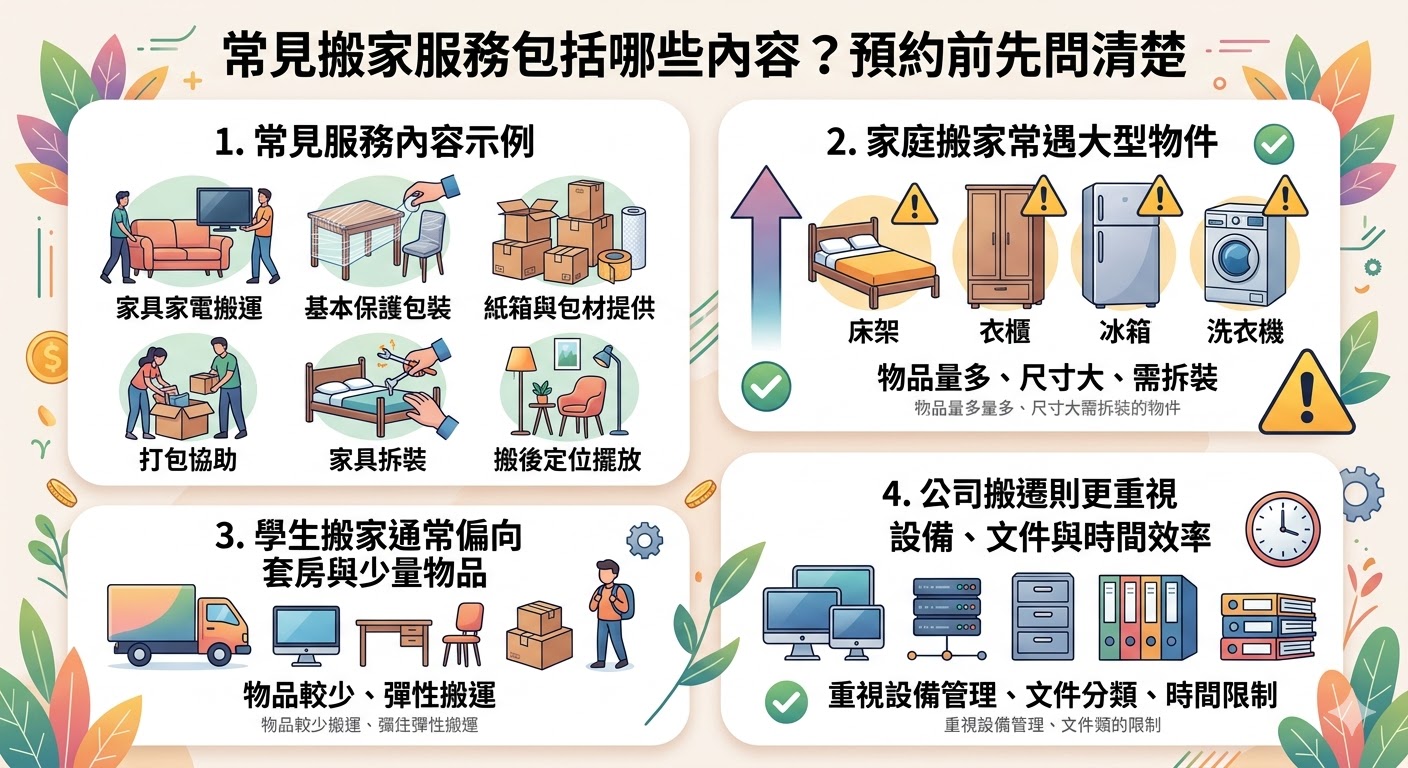 A:常見包含家庭搬家、學生搬家、公司搬遷、家具家電搬運、包材提供、打包協助、家具拆裝與定位擺放等。